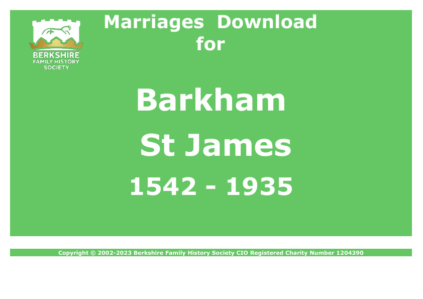 Marriages download of 513 records for Barkham St James covering the years 1542 to 1935 .The Berkshire Marriages 5th Edition CD may contain additional parishes and time periods not present on the downloads. Check the CD coverage (Berkshire Marriages 5th Edition CD Coverage) for details. Please note that copyright and database rights subsist in the content and this download is for your personal use only. The download is provided in PDF format and you will need a PDF reader such as the free Adobe Reader to view it. Once payment has been taken you will receive an email with a download link. You may download it a maximum of five times onto devices that belong to you and are operated by you. Alternative names: Barkham. St James the Great