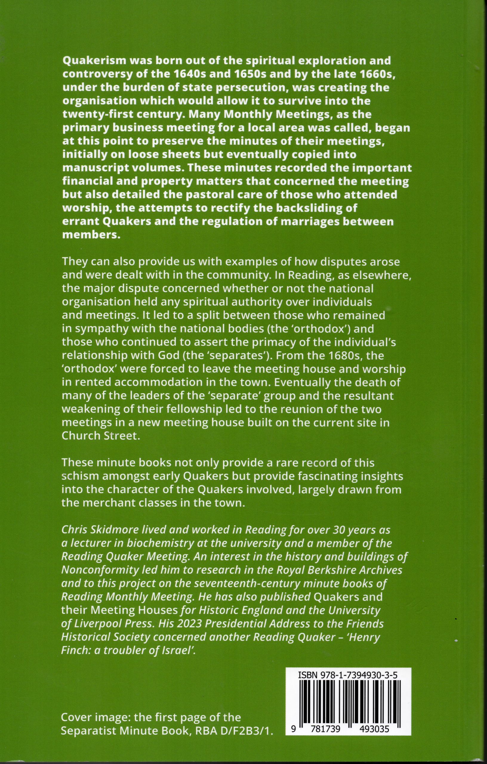 These minute books provide a rare record of the schism of the early Quakers between the “orthodox” and the “separates” who asserted the primacy of the individual’s relationship with God. The books also give an insight into the character of the Quakers in the dispute. This is Volume 32 of the Berkshire Record Society’s publications and is edited by Dr Christopher Skidmore.